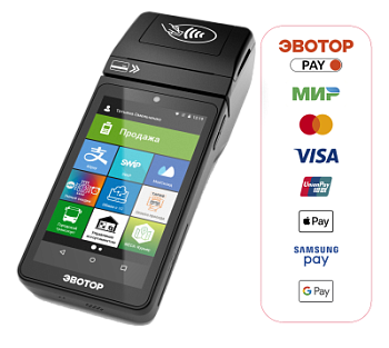 В онлайн-кассу уже встроен эквайринг «Эвотор.PAY» – остаётся подключить его онлайн за 2 дня без визита в банк. Комиссия от 1% в зависимости от типа бизнеса.