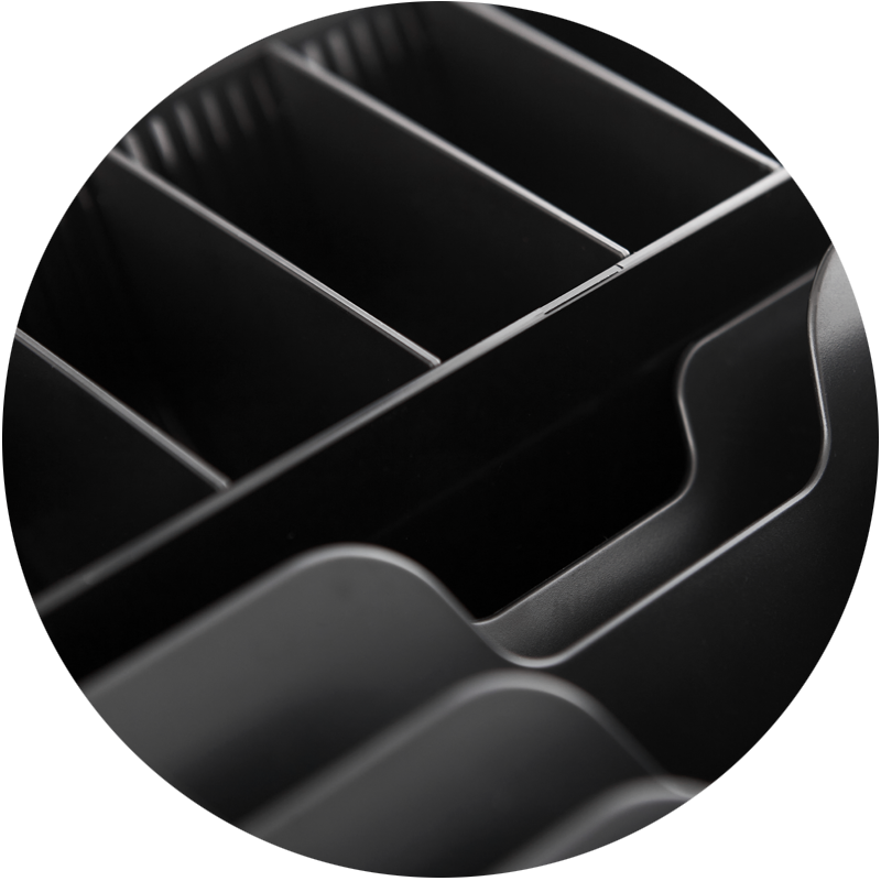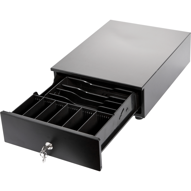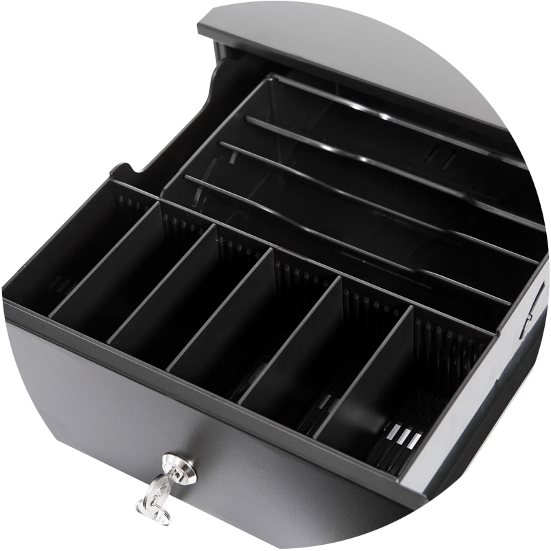 Корпус денежного ящика из нержавеющей стали. Лоток из АБС-пластика. Ячейки в лотке расположены максимально комфортно для работы с деньгами.