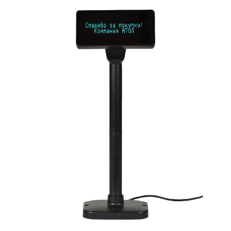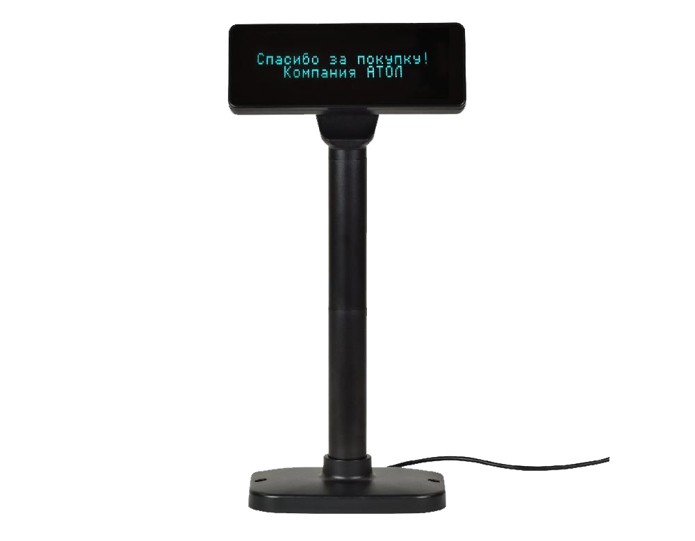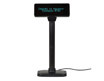 Информация для покупателя выводится в две строки по 20 символов в каждой, благодаря чему покупатель получает информацию лаконично и емко. Дисплей отличается компактными размерами и стильным современным дизайном, а подвижная конструкция дисплея позволяет свободно регулировать его высоту, угол наклона и поворота по всем плоскостям.